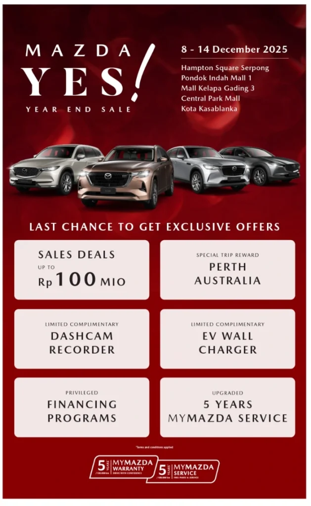 Mazda Year End Sale December 4, 2025 Dapatkan Promo YES! ( 8- 14 Desember): 5 Years Warranty / 150.000KM 5 Years My Mazda Service/ 100.000KM SALES DEALS Up to 100mio Special Financing Programs DashCam Recorder EV Wall Charger *S&K Berlaku