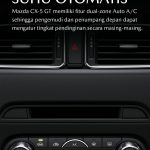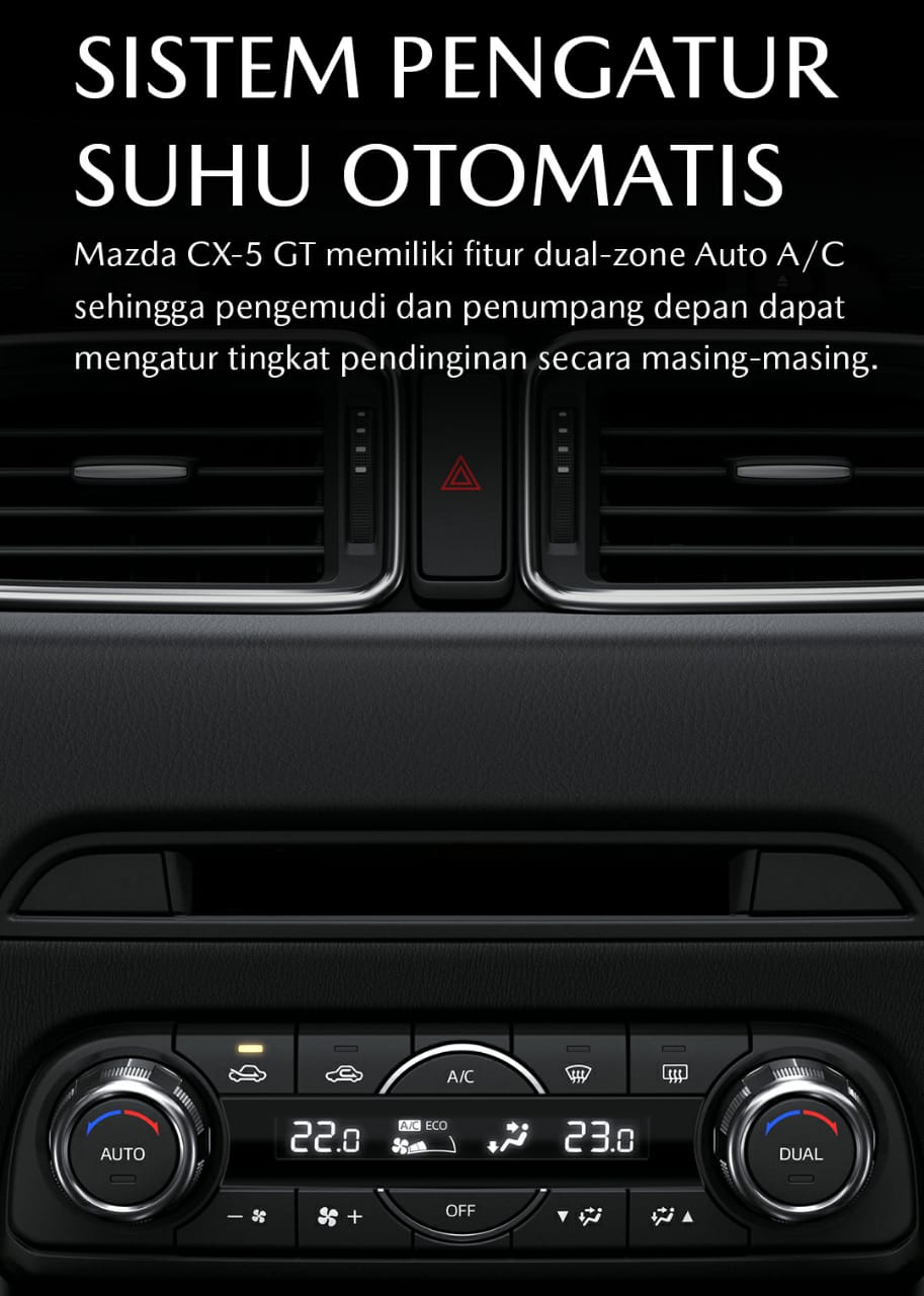 Melalui fitur dual-zone Auto A/C pada New Mazda CX-5 GT, Anda dapat nyaman mengatur tingkat pendingin secara terpisah baik pengemudi maupun penumpang baris depan. Dapatkan kenyamanan berkendara terbaik ini mulai dengan πππ₯ π±π°π΅π·π.