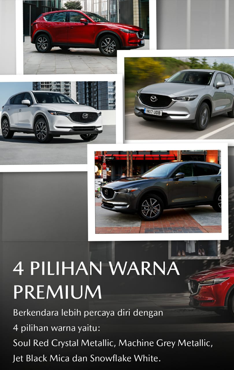 Tampil elegan dan tetap bergaya modern dengan πΆπ―π₯π¦π³ π¨π’π³π―πͺπ΄π© berwarna π΄πͺππ·π¦π³ pada eksterior New Mazda CX-5 GT.